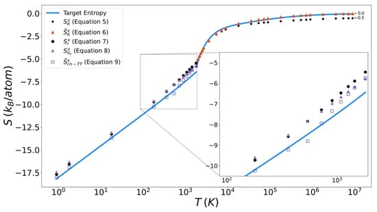 On the solid side of the curve, we compare the target entropy with the three versions of the solid entropy functional explored in this work (Equations (7)–(9)). All models produce quantitatively similar results to the target entropy obtained from thermodynamic integration. The slope is well captured. The degree to which the intercept is captured varies. For Cu (Figure 10), Fe (Figure 11), and Si (Figure 12), Equation (9) gives the best fit. It is further observed that the trend in relative entropies from Equations (7)–(9) is not the same for all three materials.