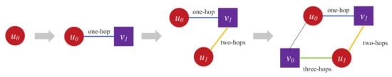 Traditional link prediction is mainly based on the structure of the homogeneous network for target nodes. For example, common neighbor (CN) and preferential attachment (PA) mainly perform link prediction on the basis of common neighbors of target nodes by only involving the single-hop neighbors of target nodes [7]. Adamic–Adar (AA) and resource allocation (RA) are based on common neighbors of the neighbors of the target nodes as the link prediction basis, mainly based on two-hop neighbors of target nodes [8]. Katz is based on all paths connected by target nodes, involving multihop neighbors between target nodes [9]. Different from homogeneous networks, the neighbor of node u in a bipartite network is always node v, and the neighbor of node v is always node u, where u and v denote two types of nodes. For the structural characteristics of a bipartite network, similar relationships between neighbors still exist. For example, in a bipartite network, edges only exist between nodes of different types, and there are no edges between nodes of the same type. As shown in Figure 1, for different types of nodes and , node reaches node through three hops, which is the shortest path between different types of nodes. Therefore, three-hop paths between node and can be used as indicators for link prediction. For example, by modeling drug–protein bipartite networks in biological networks, and on the basis of connectivity paths between target nodes, interactions between drugs and target proteins can be effectively achieved [10]. The connection of user–item–user–item in the recommender system is a recommendation indicator. The essence of recommendation is to predict the relationship between users and items, which is actually a variant of link prediction [11,12]. These link predictions are mainly based on the connectivity paths between target nodes in which network structure information is extracted. On the basis of the length of the connected paths between target nodes, extracted network structure information is different.