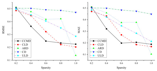 In order to verify the applicability of the method, sparsity was experimentally analyzed on five different datasets. The influence of link sparsity on DLP performance was investigated by randomly retaining linked 0.2, 0.4, 0.6, 0.8, and 1.0 in the original dataset. Results are shown in Figure 3. On the five datasets, experiments showed that the performance of DLP improved with increasing sparsity, indicating that the method relies on dense bipartite networks. At the same time, on CCMD and CLD, and decrease rapidly on the basis of the increase in links. When sparsity reached 0.8, as it increased, although the performance of the method improved, and gently decreased. On CD and ULD, the and of DLP showed a steadily decreasing trend, which indicated that the sparsity of these two datasets more smoothly impacted DLP performance. In addition, on ARD, DLP performance showed fluctuating improvement based on the increase in links. When sparsity increased from 0.8 to 1.0, the performance of DLP suddenly improved, which indicated that DLP is more affected by sparsity on ARD, that is, the denser the edges in the bipartite network are, the better the performance of DLP is.