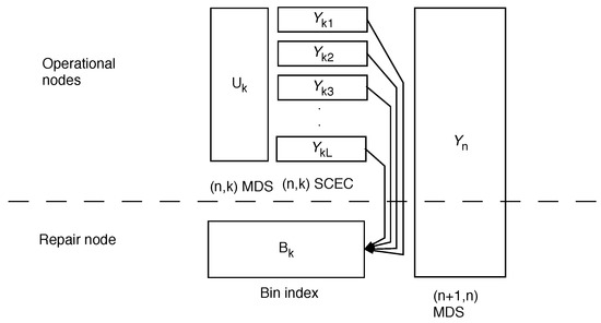 Without loss of generality and to simplify notation, we can assume that node n fails. The repair is done layer by layer. At layer 1, we copy from any node to the replacement node n. Next, from the surviving nodes we decode the repair bin index from the MDS code; if there is no extra repair information, we put . We know from the surviving nodes. In bin , we look for an index so that the corresponding codeword ; if there is more than one, there is a repair error. We then store the recovered in the replacement node n.