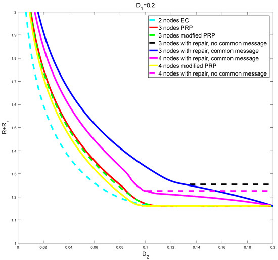 Figure 2 shows typical numerical results. All curves are for two levels of constraints, , but variable number of nodes. First, from the bottom, we have the curve for the optimum region for the two node problem according to EC [2,3]. Notice that this is achieved without any refinement information, using only correlation between the base layer random variables; refinement information is only required for and . Second, we have the curves for the three node problem, but where we use at most two nodes for reconstruction, either using [4] (Section V) directly (ignoring the constraint), or using Theorem 1 without repair. It can be noticed that using Proposition 2 gives a slight improvement; this is not due to the common message, but due to the fact that PPR uses codewords in the last layer, while the modified PPR uses only one. For the 4 node case, we use (4,1)-SCEC and (4,2)-SCEC successively, as well as (4,1)-MDS common message and (4,2)-MDS common message. Therefore, we have 2 variables and for common messages, and and for SCEC, where i = 1, 2, 3, 4. As a result, it is noted that the overall rate of the 4 node system improves over that of the 3 node system, whereas the overall rate of the 2 node system improves over that of the 3 node system where common message and SCEC were used only once. We see that a common message gives a clear improvement.
