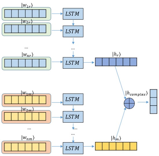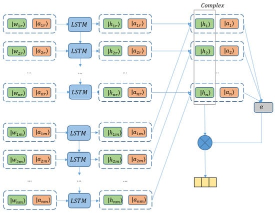 The real and imaginary parts of word embeddings are obtained in the same way with Equation (11). Then concatenated with complex-valued aspect information, word representations are fed to LSTM layers as follows: