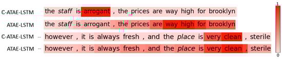 Attention visualization and comparison. The color of a word indicates the relative weight of attention for such word in each sentence, and the aspects are displayed in italic.
