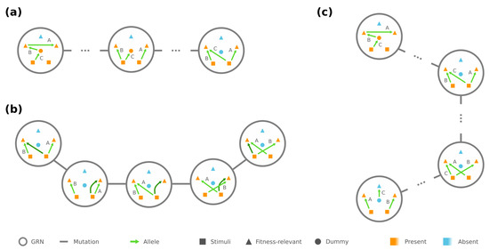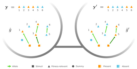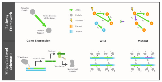 Genotypes in the pathway framework of GRNs contain all necessary information to construct a regulatory network [77,78]. More specifically, alleles at each locus include both a transcription activator and a protein product, which means the regulatory interactions among the loci can be deduced by connecting genes whose expression product corresponds to the activator of another. Compared to existing work on regulatory circuits—where mutations are modeled as rewiring a single interaction between genes [79,80]—the pathway framework considers a mutation as changing the activator/product of a gene. Lastly, the phenotype is determined by the set of loci reached in a regulatory cascade induced by external stimuli. These stimuli could be completely external to the individual or simply come from another regulatory network in the organism. For additional details on the pathway framework, see [77,78] and Figure 1 for illustration.