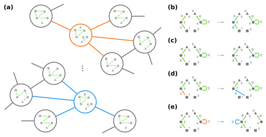 As the underlying space of a fitness landscape of GRNs, the genotype network G appears to contain redundant information. On the one hand, GRNs leading to the identical phenotype are deemed to have equal fitness. On the other hand, given any GRN, for example, the mega-node rounded by orange in Figure 4a, one can always find some other GRN such that their neighborhoods in G are locally similar, e.g., the mega-node rounded by blue. This simple demonstration suggests that the structure of the genotype network G is not arbitrary; instead, some structural symmetries exist.