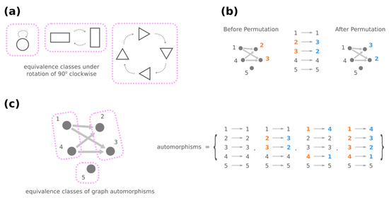 (a) As a minimal example, imagine an operation that rotates a geometric object 90 degrees clockwise. The rotation maps one object onto another (dashed arrows), and it leads to equivalence classes where objects are grouped by their symmetry under rotation (pink rectangles). (b) An automorphism of a graph is a permutation of nodes that retains the same graph. (c) Equivalence classes under graph automorphisms bring together nodes that have similar roles connection-wise in the graph.