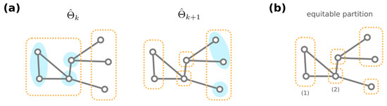 (a) Consider a toy example genotype network of GRNs. (Here, we omit the exact content of GRNs.) Given the partition , note that mega-nodes in a group (dashed orange rectangle) may share a different number of connections among other groups (blue shaded circles), and they are further divided to generate the next partition . (b) Both the equivalence classes of GRNs and the stationary partition from our iterative procedure are equitable, e.g., each mega-node in group (1) has one connection among (1), another connection with (2), and none with other groups.