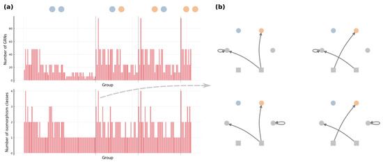 Example partition coarser than the equivalences classes of GRNs. We run the proposed iterative procedure with and , where stimuli are drawn as squares and the present/absent state of fitness-relevant proteins are colored by orange/blue. (a) The number of GRNs and the number of isomorphism classes of GRNs in each group of the obtained partition , where the dashed lines separate groups of different phenotypes and (b) isomorphism classes of GRNs in a group.