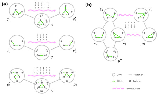 Sufficient conditions that two neighbors belong to an equivalence class. For illustration purposes, we only show the dummy proteins and omit the protein states, edge labels and self-loops in (a) three examples such that two neighbors of a GRN g are isomorphic, and (b) an example where the neighbors and of GRNs and in different equivalence classes are isomorphic.