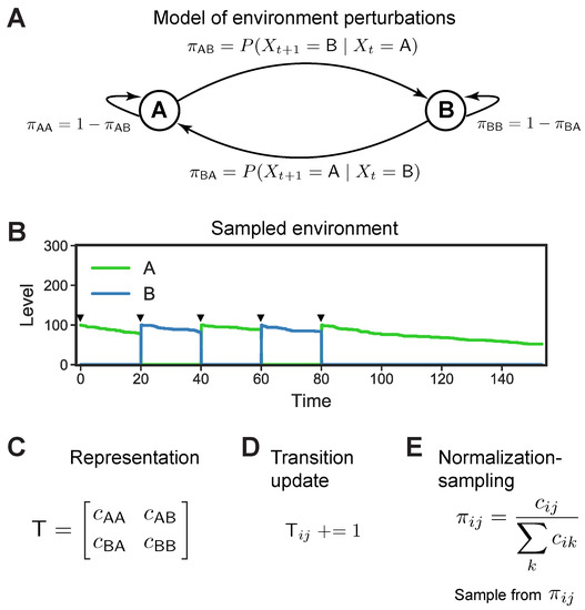 Assuming the environment’s perturbations are generated by a Markov model, probabilistic inference can be used to anticipate the environment’s states. In particular, it is useful to compute the probability of encountering A or B next given past observations of the environment’s states, , where corresponds to the state of the environment at time t. In Bayesian terms, anticipation of the environment means computing the posterior predictive distribution, . This computation is complicated by the fact that the transition probabilities and are unknown. One option in such cases is to place prior probabilities on these parameters and then integrate them out to calculate, . We take an alternative and sometimes simpler strategy of estimating the unobserved transition probabilities, and , through Bayesian inference, and use these estimates to anticipate the next state: