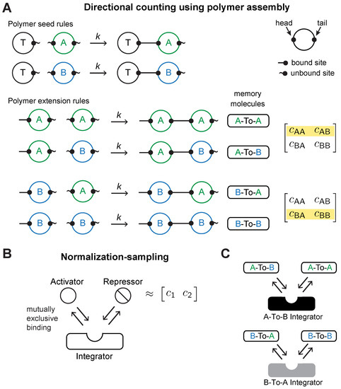 The transition history polymers are assembled as follows. We assume that the A and B molecules have a distinguishable “head” site and “tail” site, and that each polymer is built starting from a T monomer (which also has a head and tail site). Polymerization then proceeds according to two sets of rules: (i) an unbound T can bind the head of a free A or B molecule (i.e., those molecules whose head and tail sites are unbound), forming a or dimer (Figure 2A, top); and (ii) the unbound tail of a or dimer can bind the head of a free A or B (Figure 2A, bottom). This second set of rules records the direction of change by producing memory molecules corresponding to each of the four possible transitions: A-To-A memory molecule upon A to A binding, A-To-B upon A to B binding,