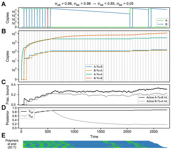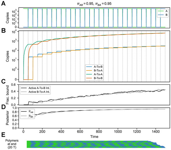 memory molecule (grey). (D) Medians of posterior distribution over the transition probabilities (black, ) and (grey, ), calculated analytically using a discrete-time Markov model (each data point corresponding to a 50 time unit interval) with a uniform prior. (E) Polymers at the end of the simulation, plotted from head (left) to tail (right) and ordered by size from shortest (top) to longest (bottom). Stretches of green correspond to runs of As, stretches of blue to runs of B (there is no relationship between this visualization of polymers and the time axis).