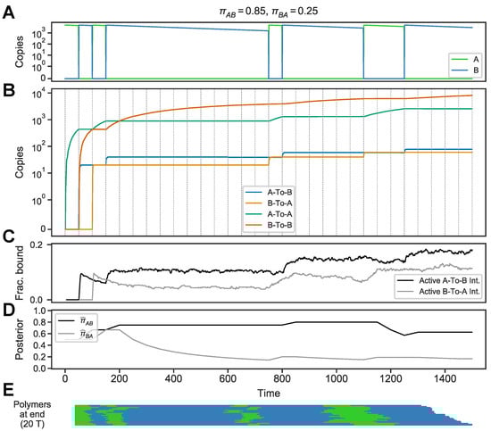 integrators. (D) Posterior medians for transition probabilities (black, ) and (grey, ), calculated using a discrete-time Markov model with a uniform prior. (E) Polymers at the end of the simulation.