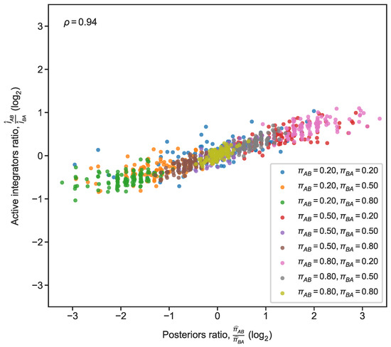 Comparison of circuit behavior with posterior estimates from idealized Markov model. Comparisons are shown for 9 different settings of that were used to produce changing environments consisting of 50 perturbations (each with duration 50 time units). Each parameter assignment is plotted in a different color (100 simulations per assignment). On x-axis, ratio of posterior estimates and for and , respectively. is the median of the posterior distribution over , and same for (x-axis values were jittered with random, small values for visualization purposes). On y-axis, ratio of the of active