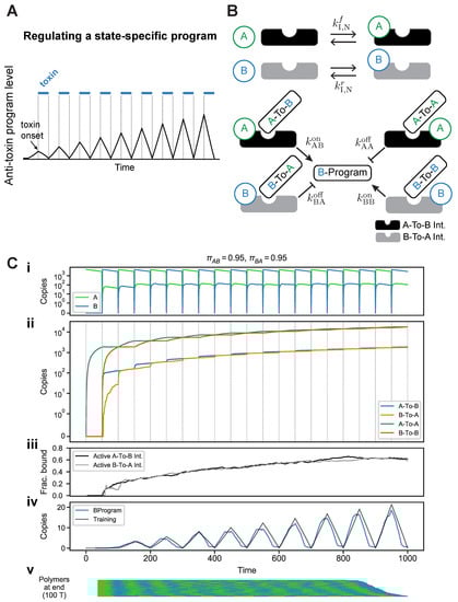 Regulating a state-specific program. (A) Hypothetical environment in which a toxin (blue horizontal lines) is pulsed periodically. An ideal expression profile for an anti-toxin program (black line): the program reaches peak expression at the onset of the toxin, and the maximal expression of the program increases as more switches between the toxin and non-toxin states are experienced. (B) A circuit for regulating a program specific to the B state, B-Program, and associated rate constants. (C) Behavior of circuit with state-specific program regulation, with rates optimized as defined in main text. (i) Levels of unbound A and B. Note that some A and B molecules are bound to integrators during a switch, which results in a mixture of As and Bs in the next pulse. (ii) Levels of circuit components. (iii) Fraction of active
