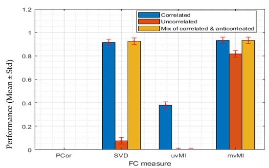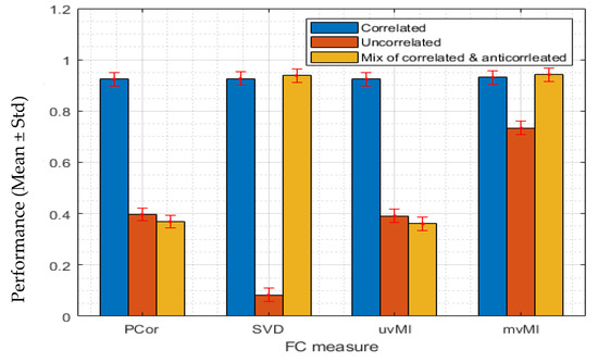 In this scenario, we evaluate the nonlinear capability of all measures. To simulate this condition, we use a power function. Data for the second region are generated using Equation (20). In this scenario, we use the same matrix for T as in the previous scenario and a different power function as f. We again consider three different covariance matrices. Regardless of the homogeneity of the activities, i.e., covariance matrices, mvMI has the highest performance and detects the nonlinear interaction between two regions. However, uvMI can detect the nonlinear interaction only for the positively correlated condition (blue bar). While MI is a nonlinear dependency, detecting the nonlinear FC between two regions by uvMI is dependent on the homogeneity of the activities. As we expected, both PCor and SVD as linear measures fail to detect the nonlinear interaction (see Figure 3).