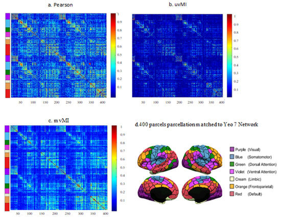 Figure 9 illustrates the average number of insignificant connections. The connection weights have significant values when using mvMI. Comparing Figure 8b and Figure 9c shows that for the PCor measure, cells with insignificant values (blue colored) in Figure 9c are those which are less similar to mvMI (yellow colored) in Figure 8b. Therefore, the insignificant connections obtained using PCor are those that are different from mvMI. This means that mvMI makes a difference in functional connections whose PCor values are insignificant. As the FC architecture of a healthy individual has a nonrandom structure that supports different cognitive functions, we evaluate the randomness level of the proposed method, mvMI. For each participant and FC measure, the sum of nonrandomness values of all edges within the functional network is calculated. The nonrandomness of an edge tends to be small when the two nodes linked by that edge are from two different communities [45]. The values for mvMI, uvMI, and PCor are 336.6, 70.07, and 27.68, respectively. The results denote that the mvMI connectivity matrix has a smaller number of random connections compared to the other two measures.