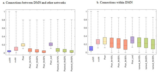 To further analyze network-based FC structures revealed by different measures, the connection weights of the average matrices across participants are displayed in Figure 7, where within- and between-network connections for the default mode network have been separated. There are some spurious connections in correlation-based connectivity matrices [43]. Thresholding is a common approach for cleaning these connections. However, thresholding also removes some real connections. Here, thresholding has removed some between- and within-network connections of the default mode network (DMN), which leads to a reduction in median value. The DMN is a set of regions that exhibit greater activity during the resting state [10]. Some diseases such as schizophrenia (SZ) and autism spectrum disorder (ASD) lead to reduced interactions within the DMN [40,44].