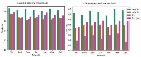 Between-subject similarity separated for within- and between-network connections. For each subject, the similarity is obtained using the correlation between the subject’s FC matrix and the average FC matrix across all subjects. Each bar illustrates the average similarity values across different subjects. (a) The result for connections that connect two regions located in the same network, or within-network connections. (b) The similarity between subjects for connections that connect two regions of different networks, called between-network connections. Different measures are separated by different colors. Each group of bars is related to a special network. Between-network connections derived using mvMI are more similar across different subjects than the other FC measures. Using PCor as a measure of FC leads to less similarity between different subjects for between-network connections.