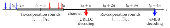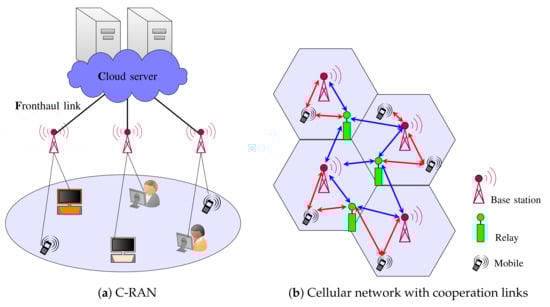 In 5G and proposed 6G systems, URLLC and eMBB users are allocated network slices, which correspond to resources within the radio access network. A key challenge is how to design resource allocation and coding schemes given that URLLC and eMBB slices have very different delay requirements. As such, the network must support mixed delay traffic. This challenge is further complicated when the radio access network exploits advanced architectures, such as cloud radio access networks (C-RANs) [11,12] (illustrated in Figure 1a) or cooperative networks (illustrated in Figure 1b).