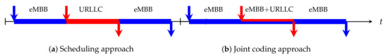 URLLC and eMBB transmissions: (a) Scheduling approach, (b) Joint coding approach.