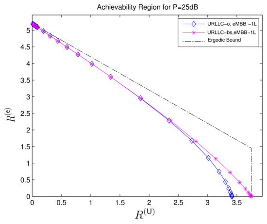 From Figure 4, we observe that for small URLLC rates , the penalty in eMBB rates is small when using the suboptimal power allocation corresponding to instead of the optimal allocation corresponding to . For larger URLLC rates, this penalty increases.