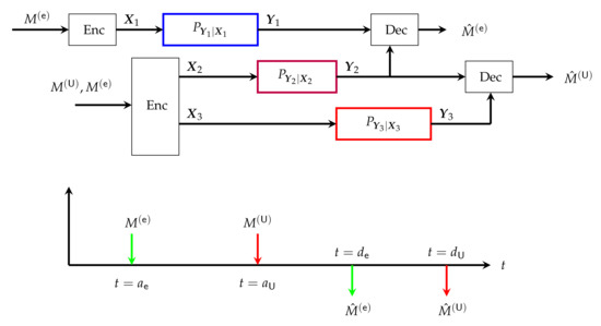 - Nikbakht, H.; Wigger, M.; Shamai, S.; Gorce, J.-M. Cooperative encoding and decoding of mixed delay traffic under random-user activity. In Proceedings of the IEEE Information Theory Workshop, Kanazawa, Japan, 17–21 October 2021; pp. 1–6. [Google Scholar]
