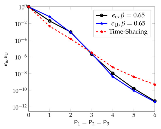 Section 3.3 summarizes the results in [54,55], which analyze a similar superposition coding approach but for Gaussian channels and in the finite-blocklength regime. The analysis is based on the concept of “parallel channels” introduced in [56].