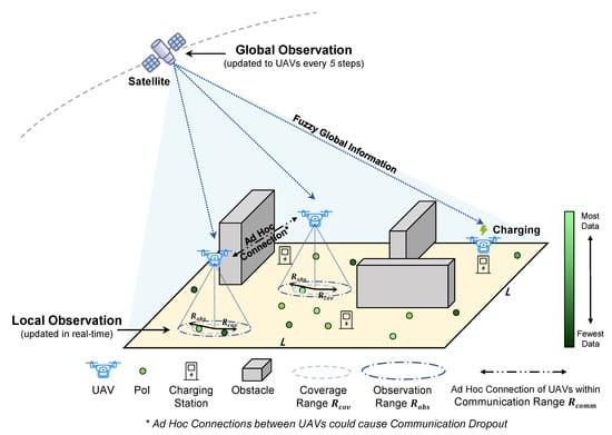 Let be U UAV agents deployed in the simulation area, where the UAVs can perform continuous and horizontal flying movements at a fixed altitude. We define as the observation range, and as the coverage range or sensing range of each UAV. Arbitrary UAV can observe the local map within the radius in real-time and receive fuzzy global map captured by satellites every some timesteps. Any PoI k within a UAV’s is recognized as covered and all its data is collected once at each timestep t. Note that is smaller than , as UAVs can only collect data when approaching to PoIs, but they can observe a wider range of area in general. Moreover, we consider the UAV swarm can autonomously form the ad-hoc network, and each pair of agents can be interconnected within communication range and exchange observed information for joint decision making. Considering the delays and packet losses in real-world ad-hoc networking, we set a communication dropout probability p between adjacent UAV nodes in training and evaluation. As for the energy consumption, we set the onboard battery status .