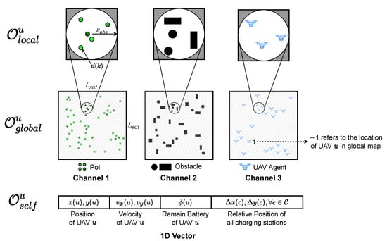 (1) Local observation from embedded sensors: UAV can observe local information within a circle of radius in real-time, centering on itself. Let denotes local observation space, which consists of three 2D vector channels. The first channel contains the data amounts and distribution of surrounding PoIs. We set the data value as the corresponding pixel value if it refers to PoI k, otherwise 0. The second channel contains the locations of obstacles relative to the UAV, where we set pixel value 1 for coordinates of obstacles, otherwise 0. The third channel includes the locations of other UAVs within . In addition, we define pixel value 1 for coordinates of UAV agents as well, otherwise 0.