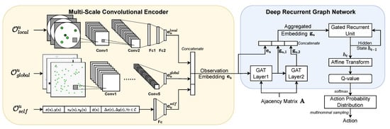 - We propose a DRL algorithm based on graph attention mechanism, namely Multi-Scale Soft Deep Recurrent Graph Network (ms-SDRGN). It integrates a multi-scale convolutional encoder to process different sizes of observations. This method also utilizes graph attention network (GAT []), gated recurrent unit (GRU []), as well as a maximum entropy method.