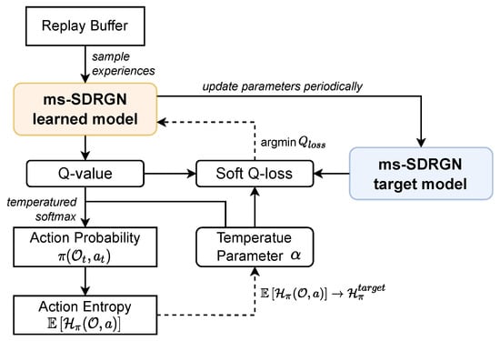 Based on the Q-value produced by DRGN, we can learn a deterministic policy, where each Q-value represents a fixed probability of the corresponding action. However, deterministic policies can easily jump into local optimum and lack for exploration in complex, real-world scenarios. Inspired by the maximum entropy RL framework [,], we utilize soft Q-loss to learn a stochastic policy in SAG-MCS, with the objective of maximizing expected reward and optimizing the action entropy towards a certain target. A flow chart of the training process is presented in Figure 4.