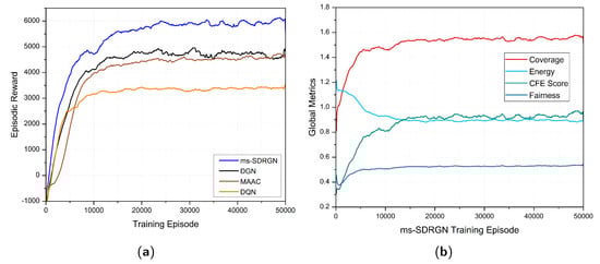 After a complete simulation episode, we calculate the metrics mentioned above as final global metrics, denoted as . We hope to maximize the coverage and fairness index for sensing data adequately, while minimize the energy consumption index for energy-saving. Therefore, following Ye et al. [], we define the overall objective coverage-fairness-energy score (CFE score) by a DRL policy :