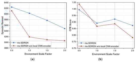 The evaluation results in environments with different scale factors: (a) mean episodic reward and (b) CFE score. (‘w/o local CNN encoder’ denotes using linear encoder to process local observations).