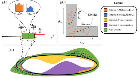 - Each cell at environment location at time t maintains an internal storage of both substrate A and B molecules, i.e., and , by absorbing A and B molecules from the environment proportionally to the concentrations and , respectively, according to a determinate constant absorption coefficient k.