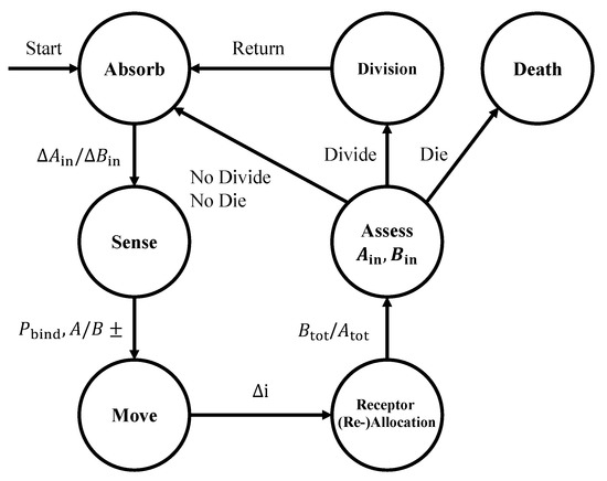 In Figure 2, we show a state machine diagram of our computational model, which is based on the definition and the cell behavior abstractions presented in Section 2.1. In particular, the discrete states of the cell and the transitions that may occur within a time sample at time include the following: absorption of A and B molecules, resulting into the changes and in the internal storage of A and B molecules, respectively; sensing through the chemical receptors, which results into the numbers of bound receptors for A and B molecules, i.e., , , , and , respectively, according to (2); movement by a discrete length based on the estimated concentration gradients, and received information modulation via receptor (re-)allocation, which follows one of the two aforementioned strategies to allocate and . Finally, the cell divides if it assesses a surplus of molecule A and B that both exceed the threshold D, or dies if its internal storage reaches the death threshold . Each of the aforementioned states reproduces the cell behaviors detailed in Section 2.1 as follows.
