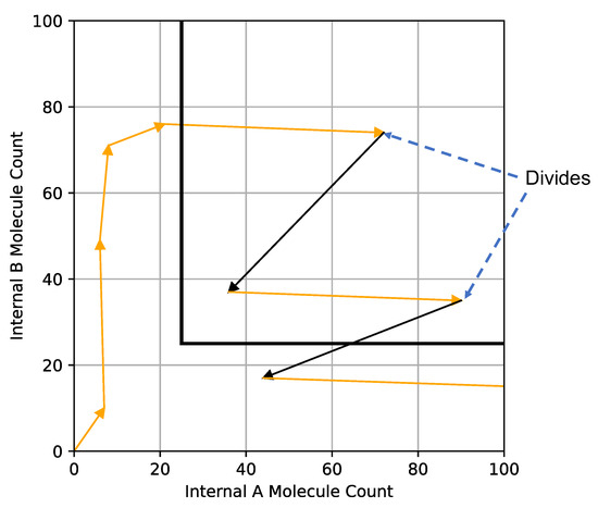 Figure 3 shows an example of the trajectory of in a simulation of the computational model. In this example, each time step is represented by an orange arrow and cell divisions by black arrows. The cell starts to gather , moves through the divide threshold, and proceeds to divide twice in two time steps and ends with a higher count below the division threshold. (This example shows how in a discrete computational model the cell could exist beyond the division threshold for multiple time steps.)