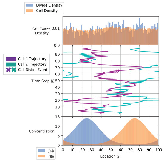 In Figure 4 and Figure 5, we show the cell’s environment for the equal and the adaptive receptor allocation strategies, respectively. The lower plot of either figure shows the A and B external concentrations following the von Mises distribution for the entire simulation space L. The center of the figures show two cells, each represented by a different color, moving left or right in the environment space. ‘x’ is used here to represent if a cell is divided in a given time step. The simulation for this figure is based on the parameters from Table 1, where i is equal to [1–100], k is equal to , S is equal to 5, is equal to 2000, is equal to 1000, and is equal to 100 time steps. The upper plot of the figures represents the division density, where the cells divide, and the cell density, where the cells are. The cell’s distribution statistics were compiled from 100 time steps and an initial cell at each location. Here, the cells have an infinite .