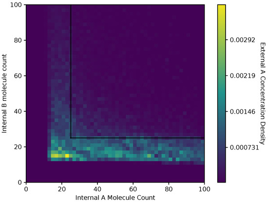 In Figure 6 and Figure 7, we show a heat map of the cell density in the and plane for equal and adaptive receptor allocation strategies, respectively. A black line that runs from 25 to 200 in each direction represents the cell division surface , as defined in Section 2.1. The simulation parameters used in these figures are the same as in Table 1, specifically with i equal to [1–100], k equal to 5, S equal to 5, equal to 10,000, equal to 9000, and equal to 30. Here, the figure is split into a two-dimensional bin matrix where the corresponding color of each bin represents the portion of cells corresponding to the bin. The color representations are consistent between Figure 6 and Figure 7 to the same portion of cells in each figure. Internal resource levels and are recorded in each time step once before the cell has a chance to divide, but after the absorption state, and again after the cell has a chance to divide. This method allows for a better visualization of the internal state of the cell.