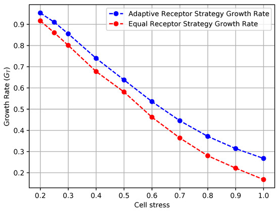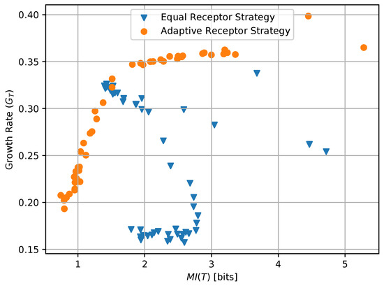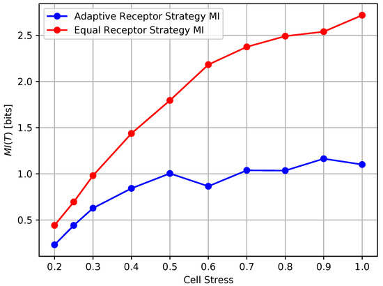In Figure 12 and Figure 13, we show the growth rate of the cells and the average MI , respectively, as defined in Section 3, for the equal receptor allocation strategy and the adaptive receptor allocation strategy as a function of the cell stress . The simulation parameters used to obtain these results are the same as in Table 1, where i is equal to [1–100], S is equal to 1, for equal to 10,000, equal to 9000, and equal to 31. The growth rate was found in another simulation with the same parameters, where the cell’s movement was sampled from a uniform random distribution between and at cell stress This growth rate was found to be slightly below the equal receptor strategy.