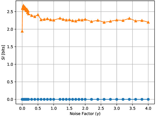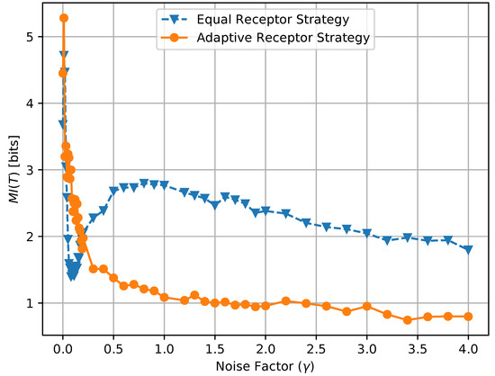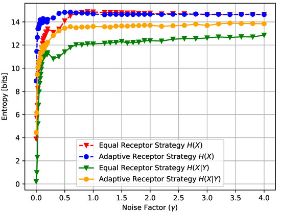 In Figure 14, the initial rise in input entropy for low noise, as the noise increases, is due to a higher mobility of the cells to sample more diverse environmental locations, and a higher range of different and values. The corresponding growth rate in Figure 15 and mutual information in Figure 16 for the equal receptor allocation seem to reach optimal values (maximum growth with minimum mutual information) before plunging when the noise increases further. The same does not happen for the adaptive receptor strategy. The input entropy then stabilizes for both strategies after the noise factor reaches value 1. For higher noise, the subtle variations in the conditional entropy seem to dominate the variations in , shown in Figure 16, which is therefore more stable, as the growth rate in Figure 15. As the noise increases, and the growth rate decrease for both strategies, as expected. Nevertheless, for all the noise values, the adaptive receptor allocation results in higher growth rates, achieved with a lower mutual information for all but in the aforementioned optimal noise region for the equal allocation.
