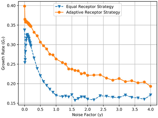 Growth of the equal receptor strategy and adaptive receptor strategy with respect to receptor noise.