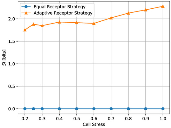 Subjective information of the equal receptor and adaptive receptor strategies as the cell stress factor is increased. The simulation parameters used to obtain these results are the same as for the results shown in Figure 13.