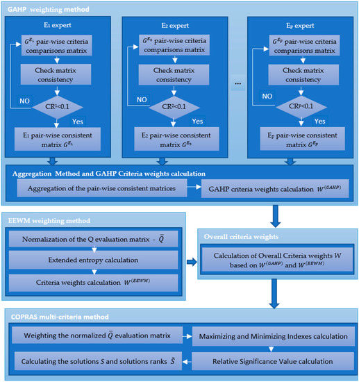 The MCDS is based on the combination of GAHP, EEWM and COPRAS methods. The overall criteria weights are calculated as a linear combination of criteria weights obtained with the GAHP and EEWM. These weights are used in COPRAS.