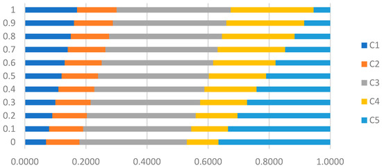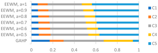 Examples of objective weighting methods are the Entropy method [32,33,34], CRITIC (Criteria Importance Through Intercriteria Correlation) [35], and the Weighted Least-Square Method [36]. Example of subjective weighting methods are the Simple Multi-Attribute Rating Technique (SMART) [37], Analytical Hierarchy Process (AHP) [38,39], Step-Wise Weight Assessment Ratio Analysis (SWARA) [40], Weighted Aggregated Sum Product Assessment (WASPAS) [41], and Best–Worst Method (BWM) [42]. A summary of criteria weighting methods is presented in [43].