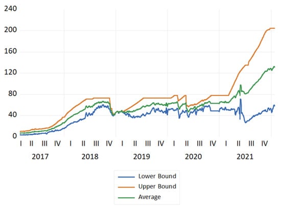 Plots of BECI UB, LB, and average during the study period (25 February 2017 to 25 January 2022).
