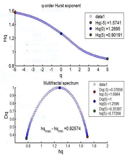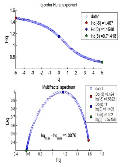 - Averaging across all segments to find qth order fluctuation function:where q can be any real number, but not zero. It is interesting to note that q = 2 coincides with the standard DFA process. Research suggests that extremely large q values (−10 or +10) increase the error in the multifractal spectrum tails [26]; therefore, q = 5 was used to calibrate such series, which is recommended by another research work [27].