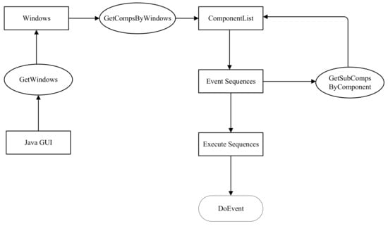 Through the above operations, we can obtain the class-level call information generated by calling all methods during the software’s running. We use automatic execution instead of manually clicking the button to execute all the functions of the program. The main steps are shown in Figure 2. First, it needs to start the program to get the window of the Java GUI software. Then, we obtain the component list through the windows, and put the event components in the component list into the event sequences. There may be some components that contain sub-components; thus, we need to use recursive methods to obtain all components. Finally, we execute the event sequences according to the event type, and obtain the dynamic call graph of the class. Figure 3 is a simple example of a Java GUI. We will explain each step in more detail in conjunction with Algorithm 1.
