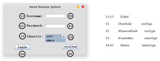 Step 1: Obtain event sequence. We use the reflection mechanism to start the News Release System on the left in Figure 3. Then, we obtain all the components (i.e., E1–E5 and L1–L3 in Figure 3) by the login windows of the News Release System. As there are some components (JMenu, etc.) that contain subcomponents, we use recursive methods (function GetAllComponents in Algorithm 1) to obtain all components. These components include interactive event components (i.e., E1–E5) and non-interactive label components (i.e., L1–L3). We distinguish these components and store the interactive event components in the event sequence.