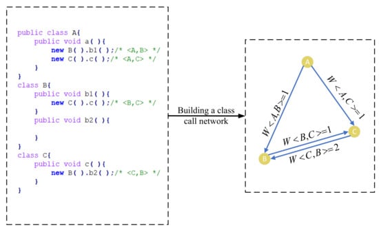 We use a simple example in Figure 4 to illustrate our network. When the method “a” of Class A is called, the interactive relationship between Class A and Class B is , the interactive relationship between Class B and Class C is and , and the interactive relationship between Class A and Class C is . Such interactive relationships are further mapped to a network, which is shown in the right part of Figure 4.